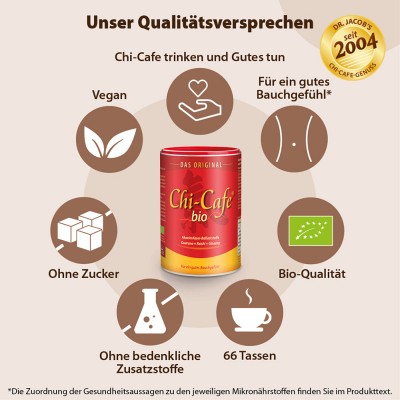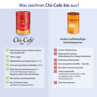 „Kann Kaffeegenuss auch gesund sein?“ Diese Frage stellte sich Dr. L. M. Jacob bereits während seiner Ausbildung im Krankenhaus und kreierte mit Chi-Cafe die erste Kaffee-Alternative in ganz Europa, die man mit gutem Gewissen mehrmals täglich genießen kann.Chi-Cafe überzeugt nicht nur durch optimal aufeinander abgestimmte Inhaltsstoffe für Gesundheitsbewusste, sondern begeistert mit seinem aromatisch-cremigen Geschmack auch wahre Kaffeeliebhaber.