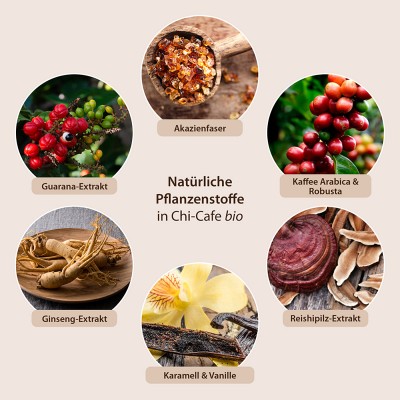 Chi-Cafe bio – der sanfte Kaffeegenuss, der ein gutes Bauchgefühl* und exzellenten Geschmack harmonisch vereint. Tauchen Sie ein in das vollmundige Aroma von erlesenem Kaffee Arabica und Robusta, kombiniert mit der milden Süße löslicher Akazienfaser-Ballaststoffe. Sie verleihen dem Kaffee eine unvergleichliche Cremigkeit und sorgen für ein geschmeidiges Mundgefühl.Die sorgfältig ausgewählten aromatisierenden Pflanzenextrakte von Ganoderma (Reishi-Pilz), Guarana und Ginseng runden dieses Geschmackserlebnis ab und verleihen Chi-Cafe bio eine harmonisch-milde Nuance.