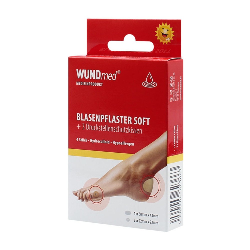 Die WUNDmed Blasenpflaster SOFT und Druckstellenschutzkissen bieten sofortige Drucklinderung für verletzte Hautpartien. Dank der atmungsaktiven, transparenten Folie wird ein Eindringen von Schmutz und Bakterien verhindert. Der sich in der Mitte befindende Kern aus Hydrocolloid sorgt dafür, dass das Wundsekret aufgesaugt wird. Die Schutzkissen schützen vor Reibung und beugen der Vergrößerung von Hühneraugen vor.
