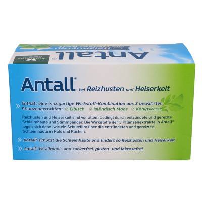 Nur Antall® kombiniert die zwei bewährten Pflanzenextrakte Eibisch und Isländisch Moos mit der altbekannten Königskerze. Antall® legt sich wie ein Film auf die entzündeten Schleimhäute und schützt damit Hals und Rachen vor äußeren Einflüssen. Hustenreiz und Heiserkeit beruhigen sich rasch. Antall® fördert so den Heilungsprozess, die Schleimhäute erholen sich schneller und nehmen ihre Abwehrfunktion wieder auf.