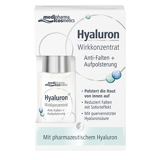 Mit zunehmendem Alter bilden sich durch verschiedene Umwelteinflüsse und dem Abbau der körpereigenen Hyaluronsäure immer mehr Falten und die Haut verliert zunehmend an Feuchtigkeit. Das Hyaluron Wirkonzentrat Anti-Falten + Aufpolsterung reduziert Falten schon ab der ersten Anwendung, quervernetzte Hyaluronsäure wirkt glättend und polstert die Haut von innen auf.
