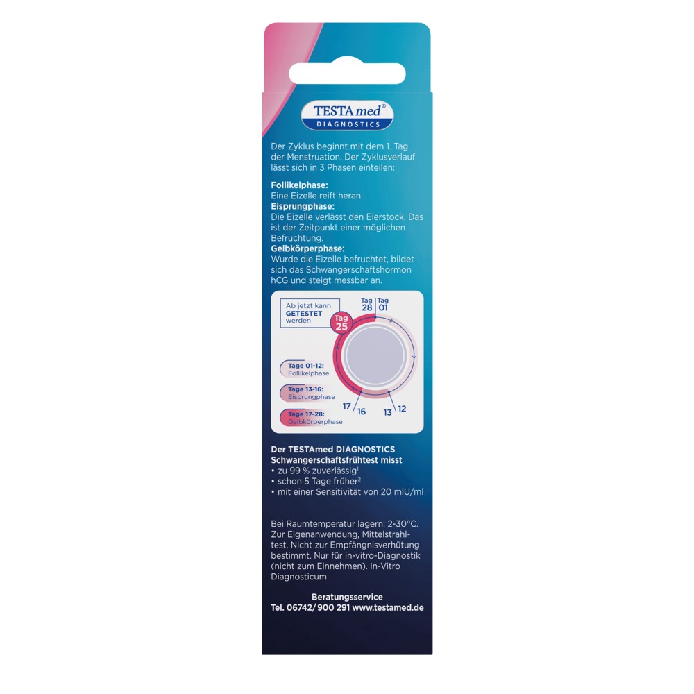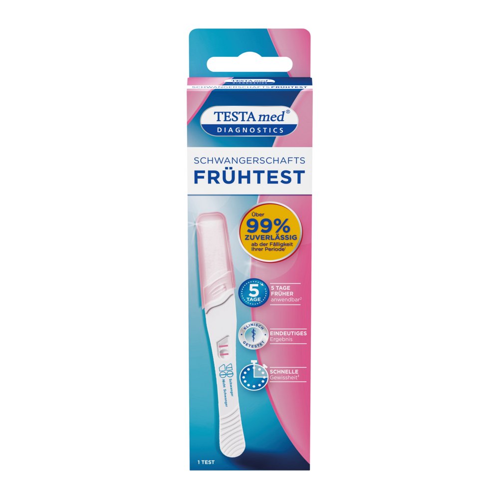 Der TESTAmed DIAGNOSTICS SchwangerschaftsFRÜHTEST -sensitive- weist das Hormon hCG schon ab einer Konzentration von 20 mIU/ml nach und liefert ein sicheres Testergebnis von über 99 % Zuverlässigkeit ab dem Fälligkeitstag der Periode.Schnelles und klares Resultat schon nach wenigen Minuten einfache und sichere Anwendung ab Fälligkeit der Periode zu jeder beliebigen Tageszeit durchführbar Sensitivität von 20 mIU/ml hCG