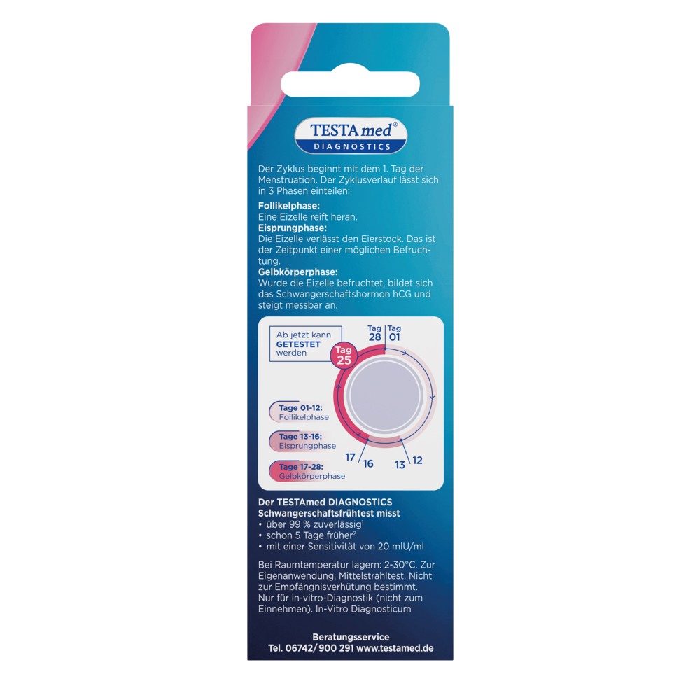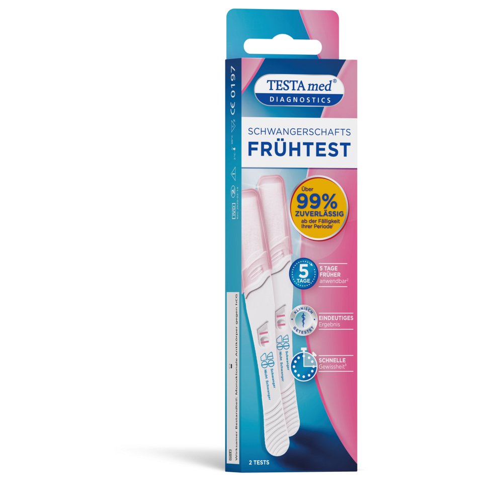 Der TESTAmed DIAGNOSTICS SchwangerschaftsFRÜHTEST -sensitive- weist das Hormon hCG schon ab einer Konzentration von 20 mIU/ml nach und liefert ein sicheres Testergebnis von über 99 % Zuverlässigkeit ab dem Fälligkeitstag der Periode.Schnelles und klares Resultat schon nach wenigen Minuten einfache und sichere Anwendung ab Fälligkeit der Periode zu jeder beliebigen Tageszeit durchführbar Sensitivität von 20 mIU/ml hCG