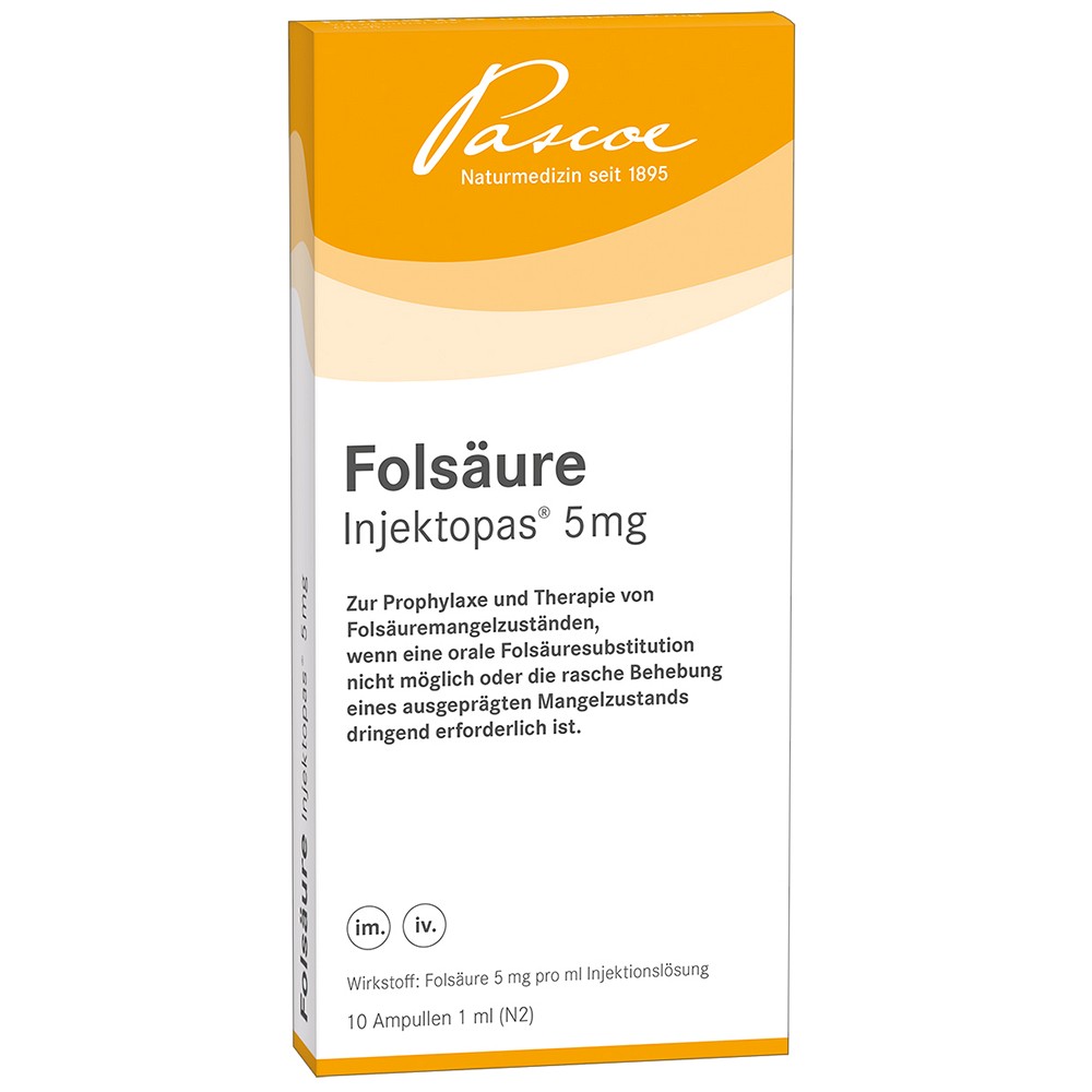 Wirkstoff: Folsäure 5 mg pro ml Injektionslösung. Zur Prophylaxe und Therapie von Folsäuremangelzuständen, wenn eine orale Folsäuresubstitution nicht möglich oder die rasche Behebung eines ausgeprägten Mangelzustands dringend erforderlich ist. Enthält Natriumchlorid.