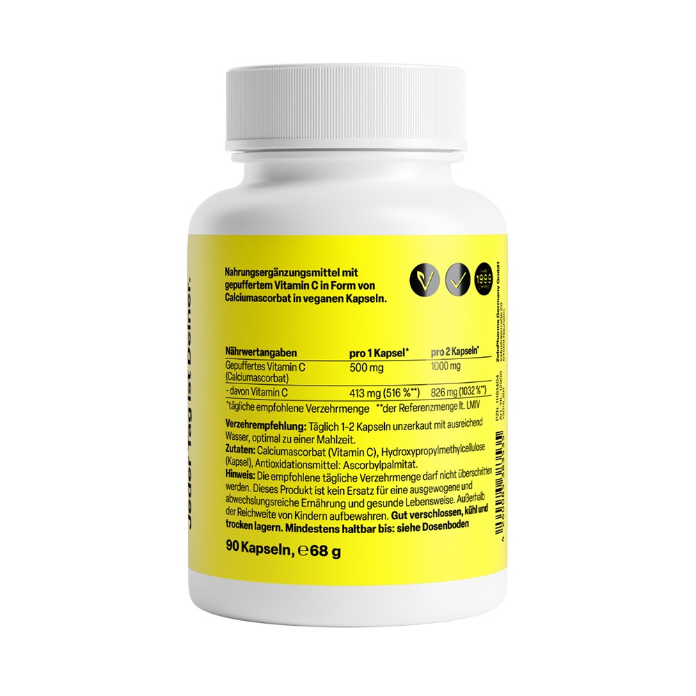 - 500 mg hochdosiertes, biologisch aktives Vitamin C in jeder Kapsel