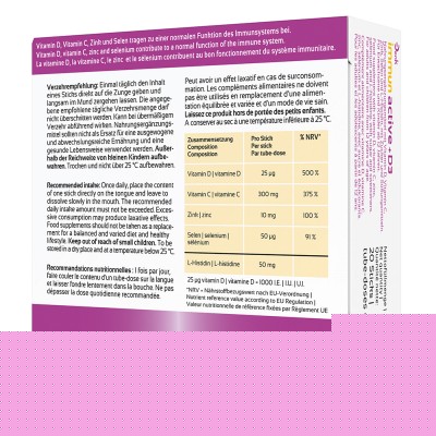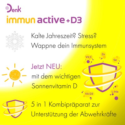 Mit der Kombination aus Vitamin C, Zink, Selen und L-Histidin unterstützt immun active+D3 aktiv Ihre Abwehrkräfte. Das Plus: Das zusätzlich enthaltene "Sonnenschein-Vitamin" Vitamin D3, das zur normalen Funktion des Immunsystems beiträgt.