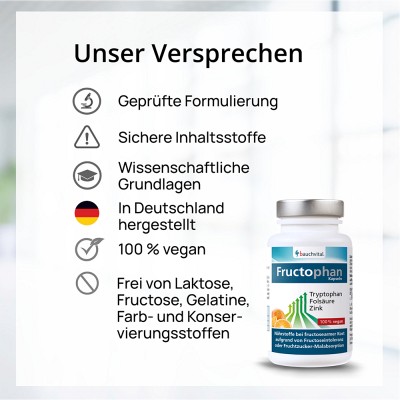 Nahrungsergänzungsmittel mit Tryptophan, Folsäure und Zink zur Ergänzung eines erhöhten BedarfsMenschen mit Fruchtzucker-Malabsorption und Fructose-Intoleranz leiden signifikant gehäuft unter erniedrigtem Tryptophan-, Folsäure- und Zink-Spiegel. Depressive Verstimmungen, Schlafstörungen, Heißhunger, Konzentrationsstörungen, häufige Infektionskrankheiten, brüchiges Haar und Nägel sowie weitere Folgeerkrankungen können auftreten.