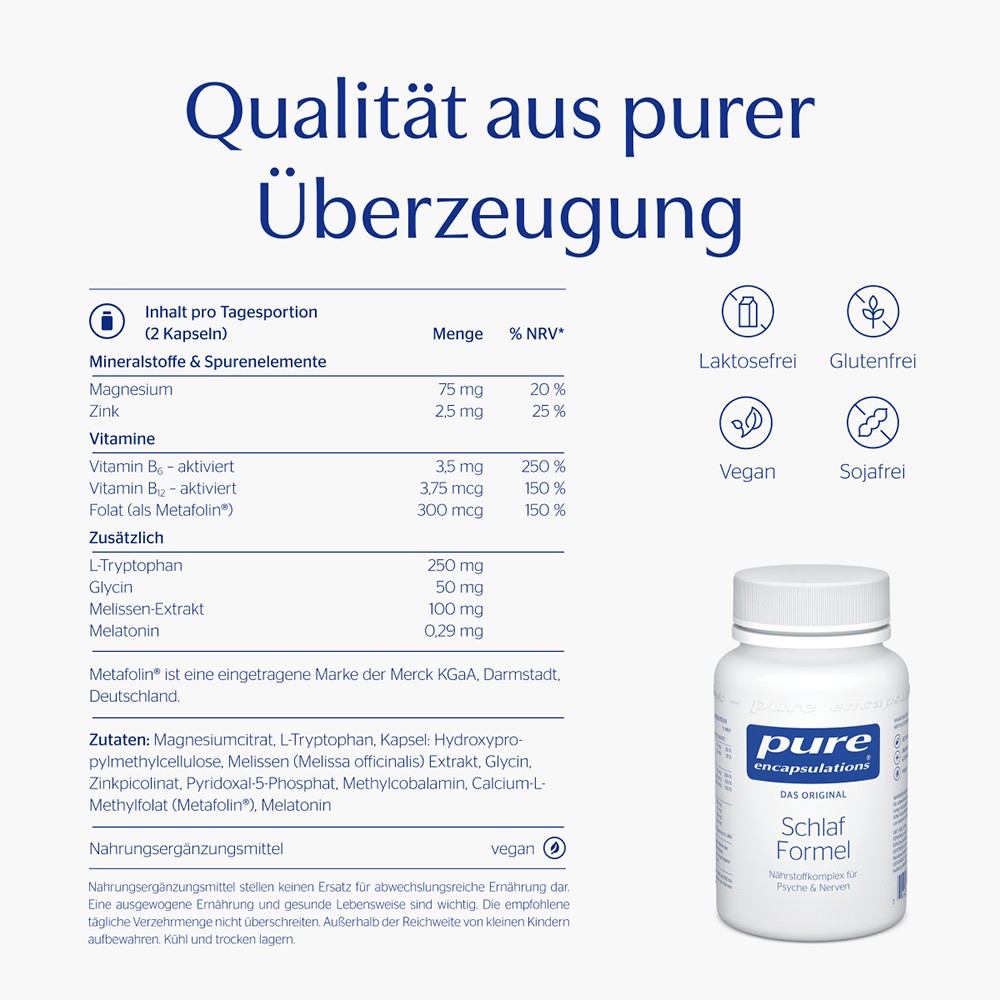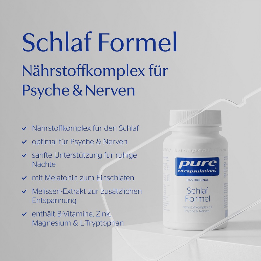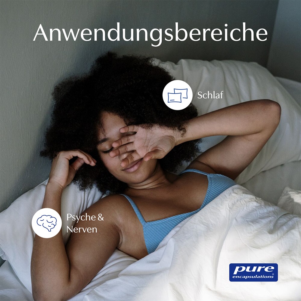 Durchschlafen füllt die „Energie-Akkus“ des Organismus und tut unserer Stimmung gut. Die Schlaf Formel von Pure Encapsulations® kombiniert ausgewählte Mikronährstoffe mit dem Extrakt der traditionell bewährten Melisse, die aufgrund ihrer entspannenden Eigenschaften beim Einschlafen unterstützt.Die in der innovativen Formel enthaltenen B-Vitamine sowie der Mineralstoff Magnesium sind wichtig für starke Nerven und eine gesunde Psyche. Melissen-Extrakt hat einen entspannenden Effekt und hilft beim Einschlafen.