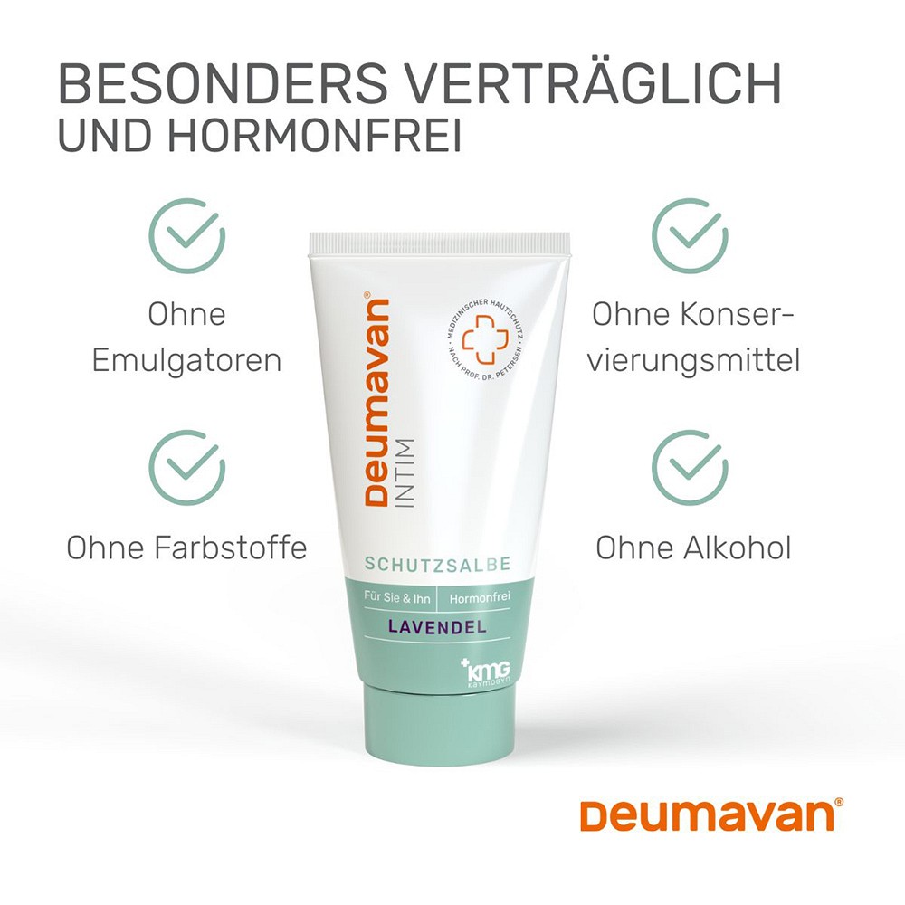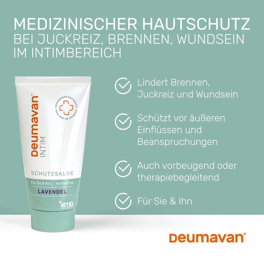 DEUMAVAN Schutzsalbe ist ein Medizinprodukt und wurde vom Gynäkologen Professor Dr. Eiko E. Petersen entwickelt. Sie ist bei vielen Beschwerden der empfindsamen Haut im äußeren Intim- und Analbereich anwendbar. Sie lindert Brennen, Juckreiz und Wundsein bei trockener und geschädigter Intimhaut, schützt die Haut vor Läsionen und Reizungen bei mechanischer Belastung und unterstützt die Hautbarriere im Schutz vor äußeren Einflüssen.