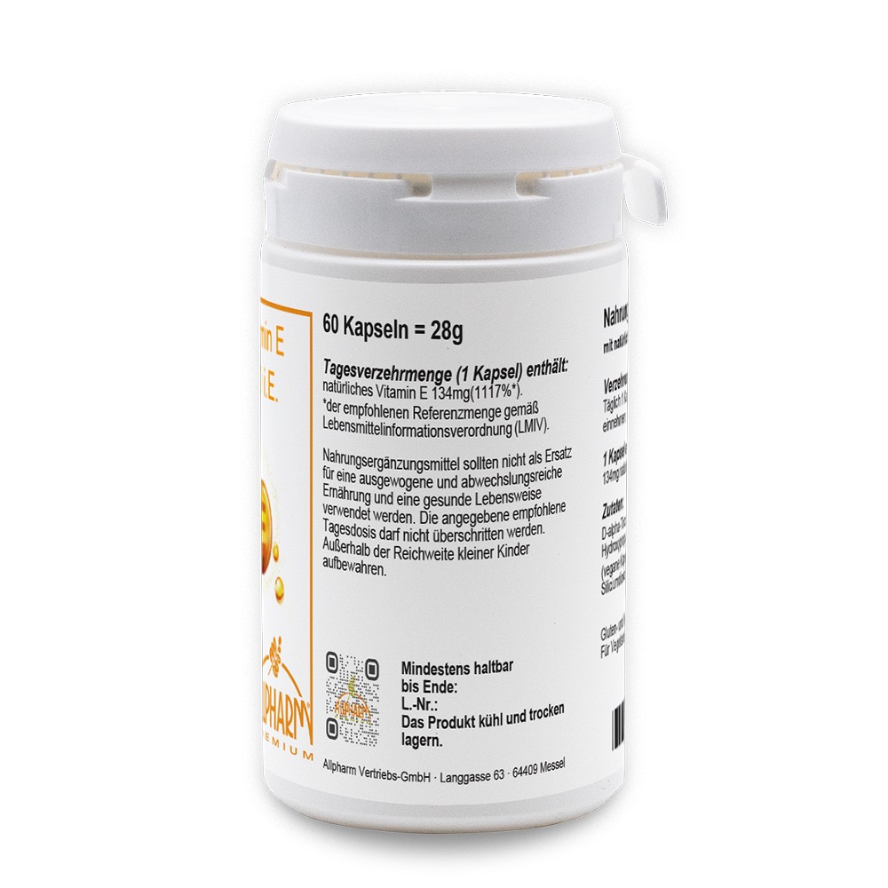 Vitamin E zählt neben Vitamin A und Vitamin C zu den wichtigsten Antioxidantien. In dieser Funktion schützt es die Zellen vor oxidativem Stress. Dabei handelt es sich um eine Stoffwechsellage, in der die sogenannten freien Radikale die Überhand gewinnen und erheblichen Schaden anrichten können.Allpharm Premium – Das beste aus der Natur für Sie zu Hause…