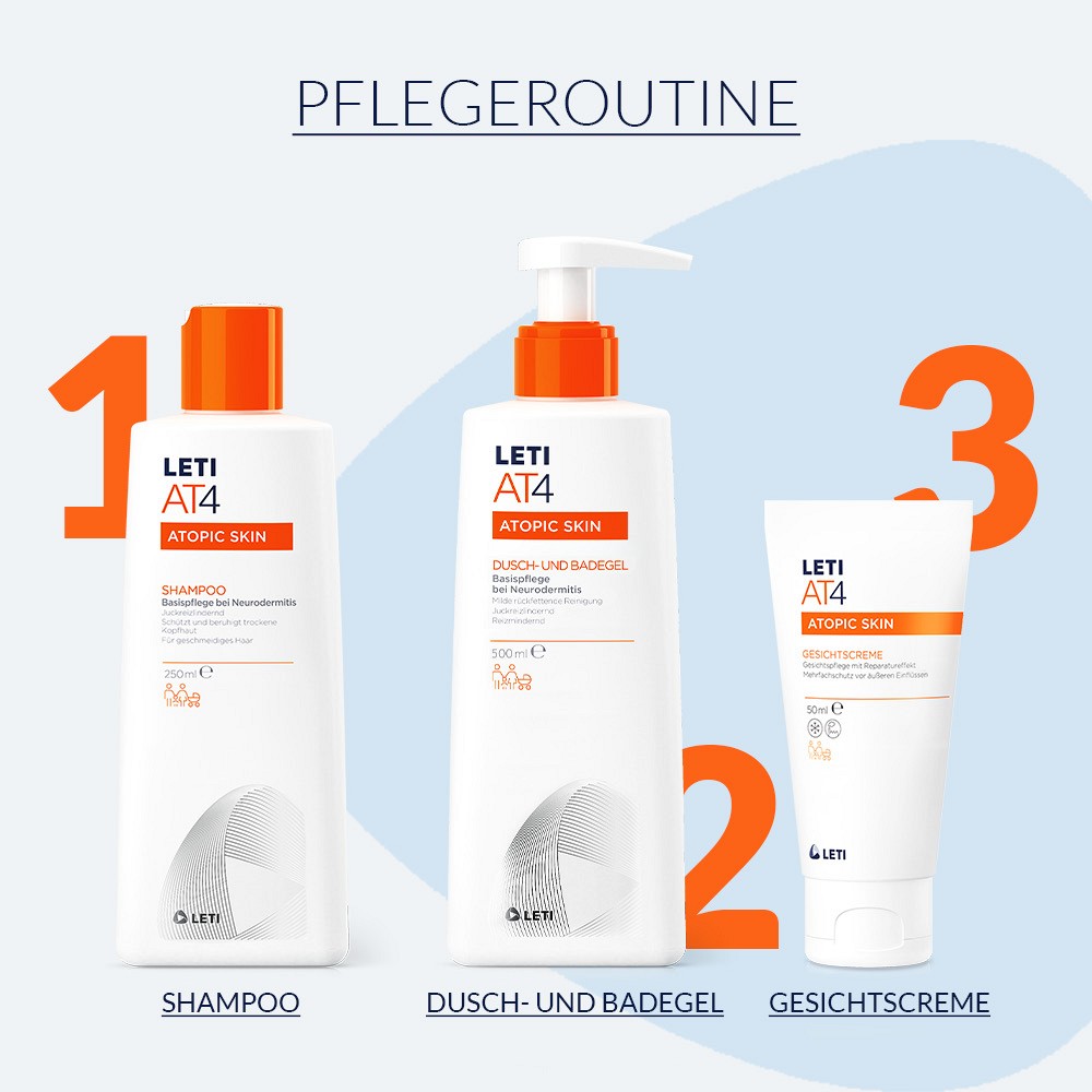 Die Pflegelinie LETI AT4 wurde speziell für die Bedürfnisse von trockener oder zu Neurodermitis neigender Haut (med.: atopische Dermatitis) entwickelt.