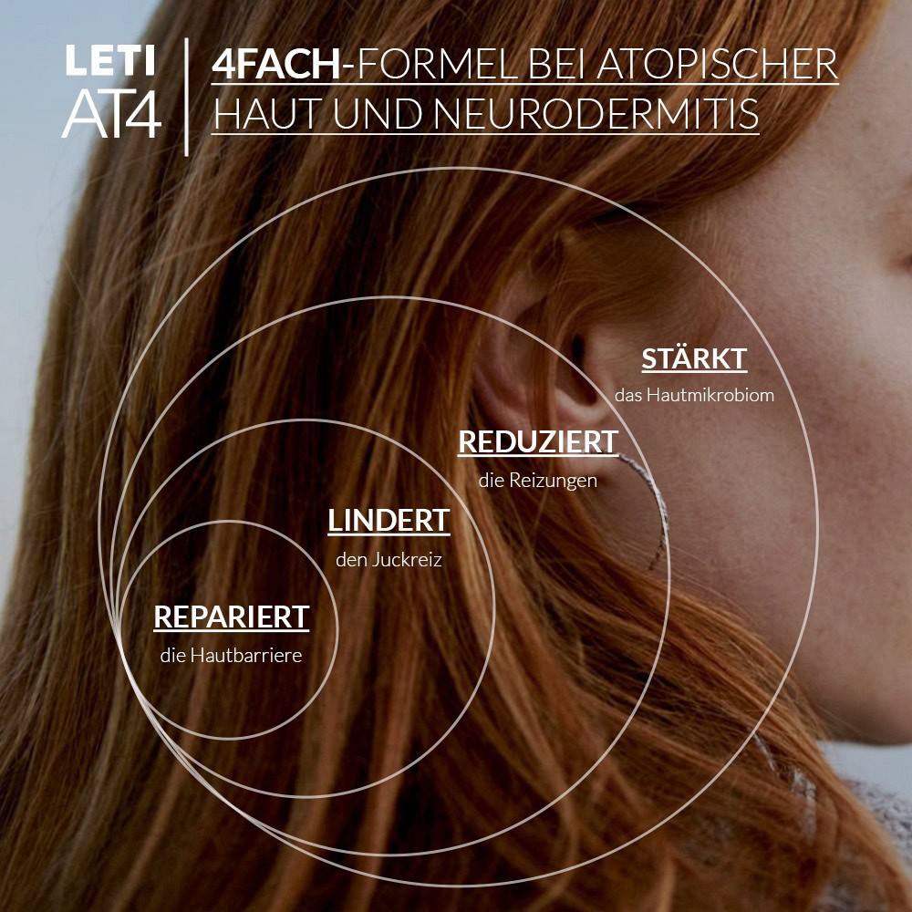 Das „AT“ in LETI AT4 steht stellvertretend für „ATopisch“ – die „4“ für die Wirksamkeit der Pflegelinie gegen die 4 typischen Symptome einer atopischen Dermatitis bzw. Neurodermitis wie: Hauttrockenheit, Juckreiz, Hautreizungen und die Neigung zu Superinfektionen (eine Überinfektion der Haut mit verschiedenen Erregern).
