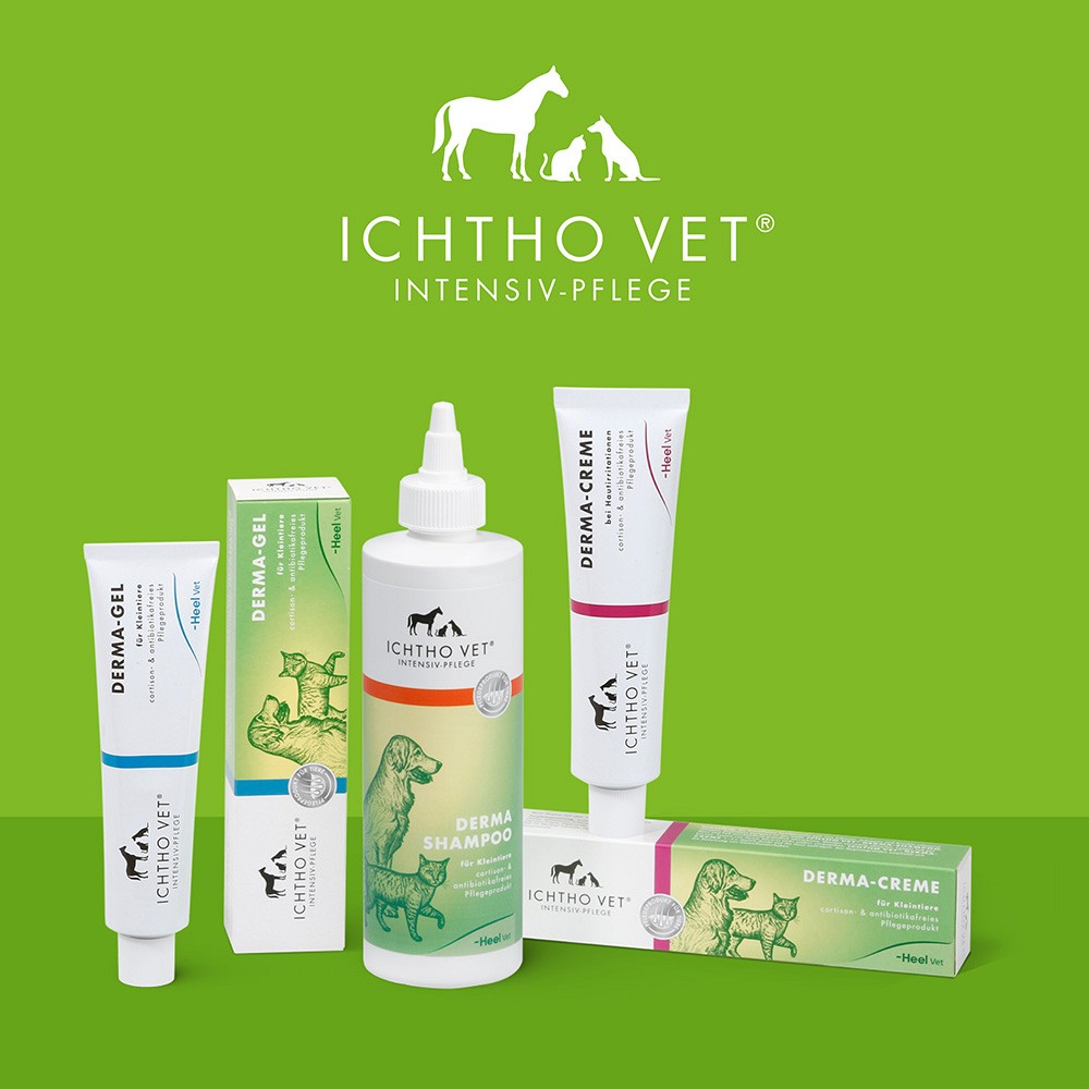 Mit der Pflegelinie Ichtho Vet steht Tierärzten/-innen und Tierbesitzern/-innen ein umfangreiches Produktsortiment für die Intensiv-Pflege empfindlicher und strapazierter Tierhaut zur Verfügung. Alle Ichtho Vet Pflegeprodukte besitzen eine auf die jeweilige Anwendung abgestimmte Rezeptur und Galenik.