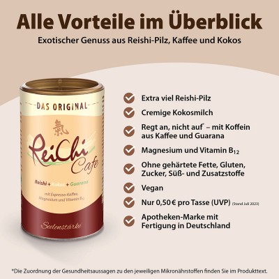 Das Besondere an ReiChi Cafe ist seine einzigartige Komposition aus dem fein-herben Aroma des Reishi-Pilzes, Ginseng, Guarana und Espresso-Kaffee kombiniert mit der mild-cremigen Note von Kokosmilch.Feinste Espresso-Bohnen, sorgfältig ausgewählt und schonend geröstet, verfeinern sein unvergleichliches Aroma. Probieren Sie dieses paradiesische Kaffeeerlebnis und lassen Sie sich von seiner sanften Kraft** durch den Tag tragen.