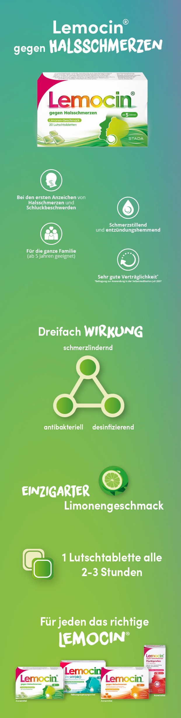 Es muss nicht einmal eine richtige Halsentzündung oder Reizhusten sein: Schon bei den ersten Anzeichen von Halsschmerzen, wenn es im Hals kratzt, die Stimme belegt ist und Schluckbeschwerden auftreten, wird der Alltag beschwerlich. Besonders für Familien und berufstätige Eltern, die keine Zeit haben um krank zu sein.Lemocin gegen Halsschmerzen hilft schon bei den ersten Anzeichen von Schluckbeschwerden und verschafft effektiv Linderung. Denn Lemocin Lutschtabletten wirken nicht nur schmerzlindernd, sondern auch antibakteriell und desinfizierend – und schmecken lecker nach Limone.