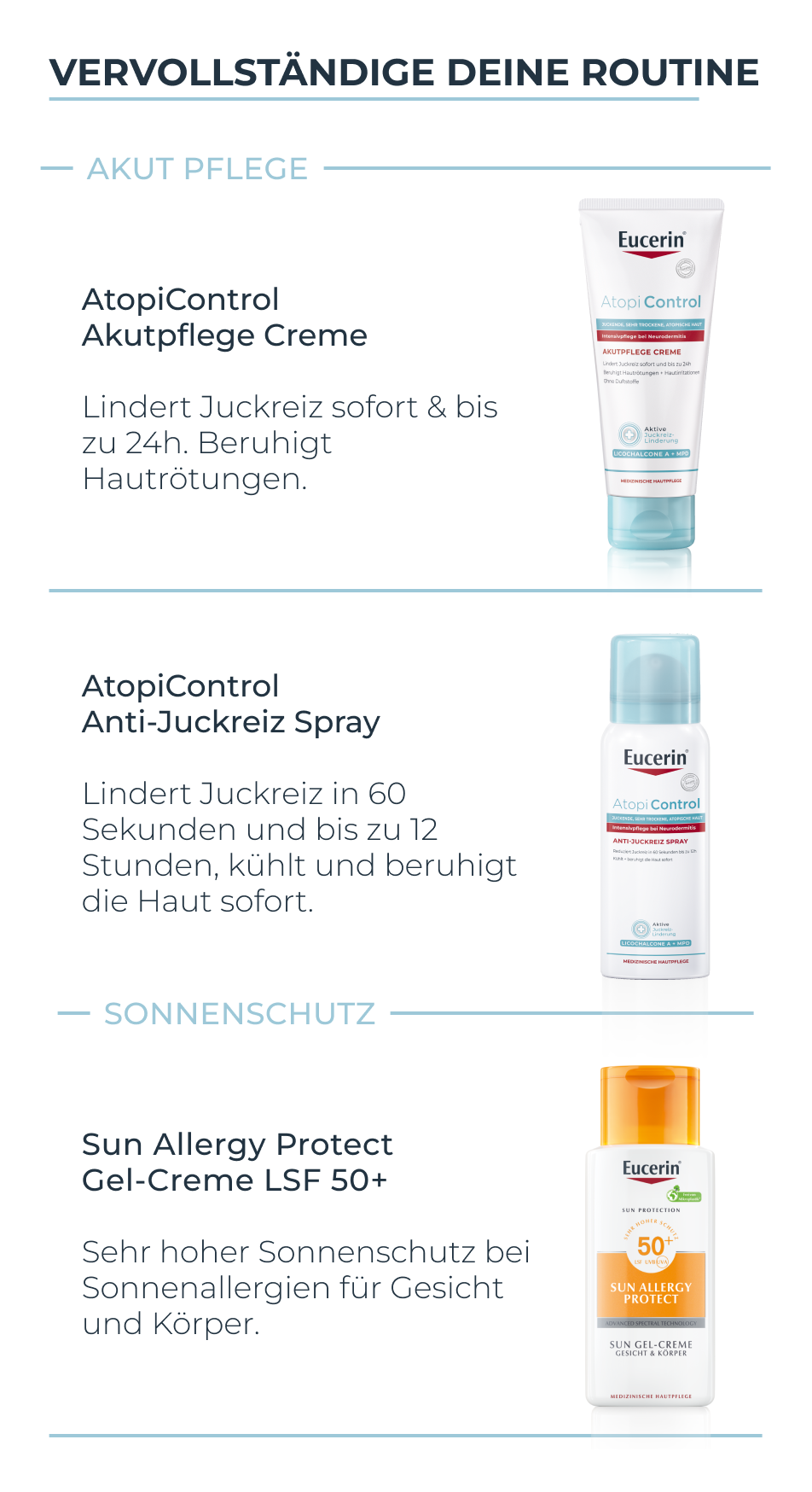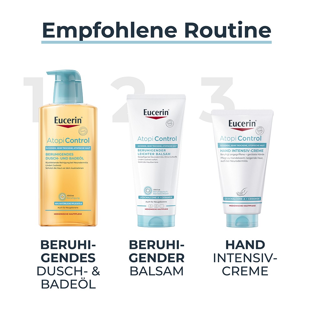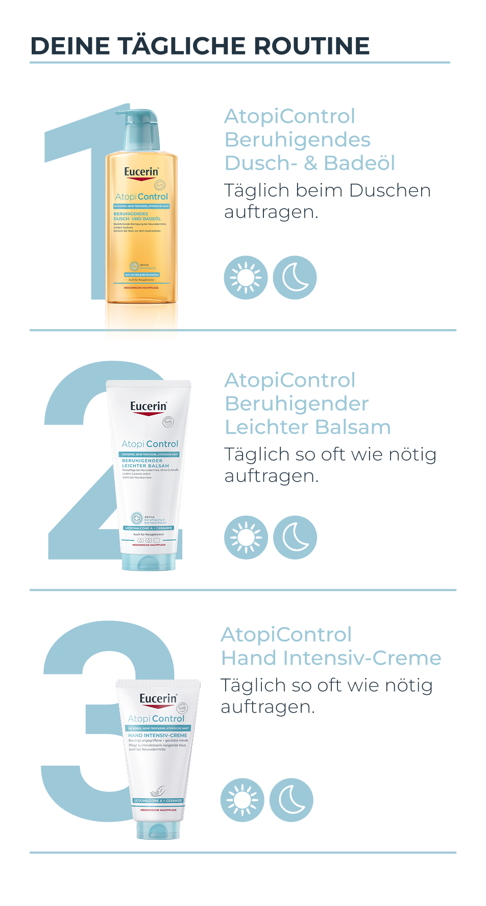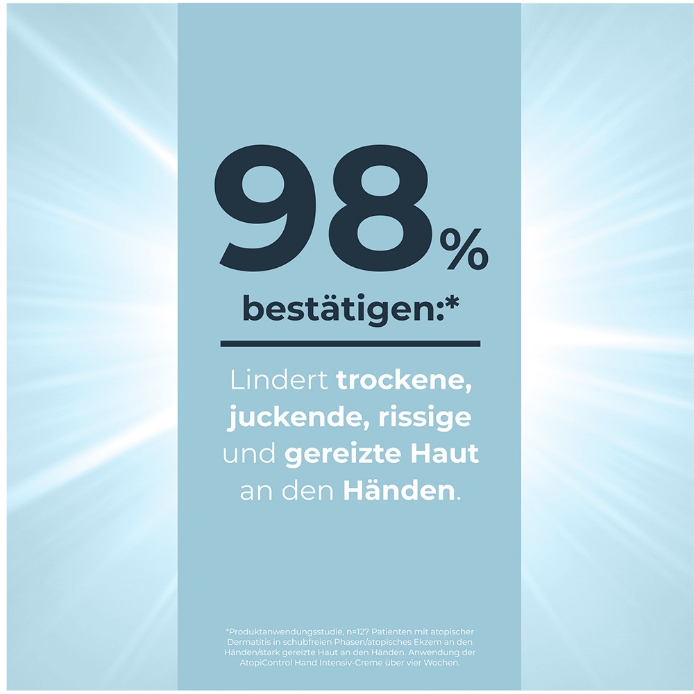 Die Hände mit einem milden, seifenfreien Handwaschmittel reinigen. Bei zu Handekzem neigender Haut die AtopiControl Hand Intensiv-Creme täglich verwenden, bei Bedarf auch öfter.*Produktanwendungsstudie, n=127 Patienten mit atopischer Dermatitis in schubfreien Phasen/atopischem Ekzem an den Händen/stark gereizter Haut an den Händen. Anwendung der AtopiControl Hand Intensiv-Creme über vier Wochen.