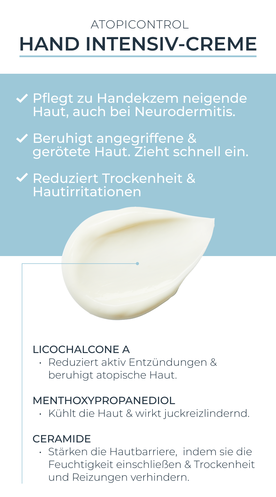 Angegriffene, trockene und gereizte Hände werden mit der AtopiControl Hand Intensiv-Creme intensiv gepflegt und die Belastbarkeit der Haut erhöht. Die Haut an den Händen kann durch häufigen Kontakt mit Wasser oder auch Reinigungsmitteln vermehrt trocken, gereizt, rissig und gerötet sein und braucht dadurch besondere Pflege.Pflanzliche Wirkstoffe wie Licochalcone A (Süßholzwurzelextrakt) und Ceramide beruhigen die Haut und wirken unterstützend, um die natürliche Hautbarriere wiederherzustellen. Mit dem enthaltenen Menthoxypropanediol (MPD) wirkt die Handpflege kühlend und lindert Juckreiz.