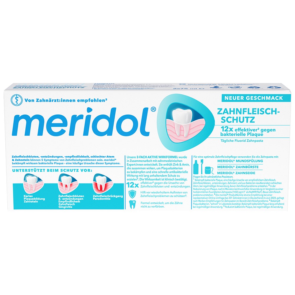 Für den optimalen Schutz verwenden Sie die meridol Zahnfleischschutz Zahnpasta als Teil Ihrer täglichen Mund- und Zahnpflege mit der meridol Zahnfleischschutz Mundspülung, der meridol Zahnfleischschutz Zahnbürste und der meridol Zahnseide.
