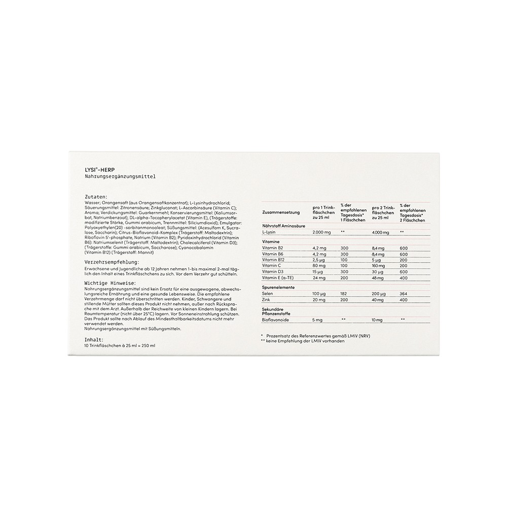+ NAHRUNGSERGÄNZUNG – Trinkampulle mit hochdosiertem L-Lysin (2000 mg pro Trinkampulle), Zink, Bioflavonoiden, Selen, Vitamin D3, Vitamin C, Vitamin B12, B6, B2