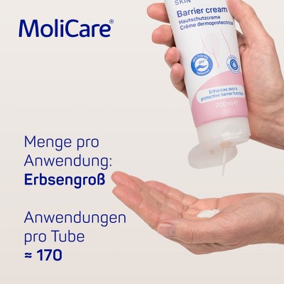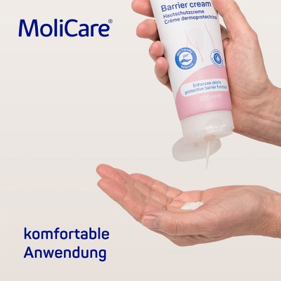 Die MoliCare® Skin Hautschutzcreme dient bei Inkontinenz zum Schutz der Haut im Intimbereich. Sie bildet einen durchsichtigen Schutzfilm auf der Haut ohne die Saugfähigkeit von Inkontinenzprodukten zu beeinträchtigen.Mit Nutriskin Protection Complex(3) zur Verbesserung der hauteigenen Barrierefunktion. Zinkoxidfrei.