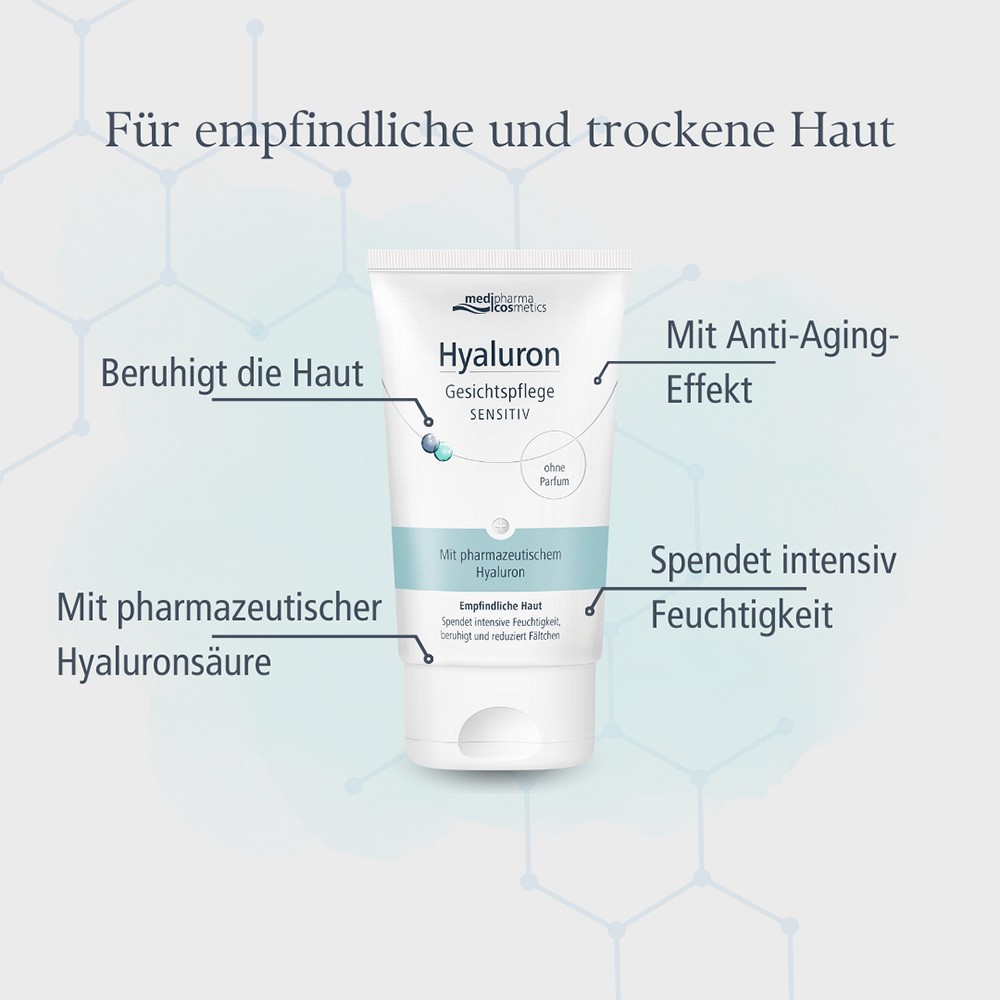 Die Hyaluron Gesichtspflege Sensitive von medipharma cosmetics pflegt empfindliche und trockene Haut durch intensive Feuchtigkeit. Die enthaltene Hyaluronsäure mildert Fältchen und begünstigt somit ein ebenes Hautbild.- Beruhigt die empfindliche und strapazierte Haut