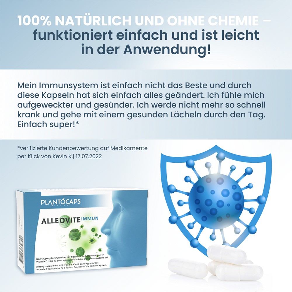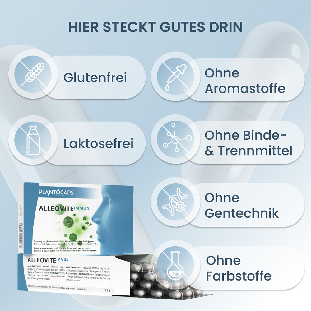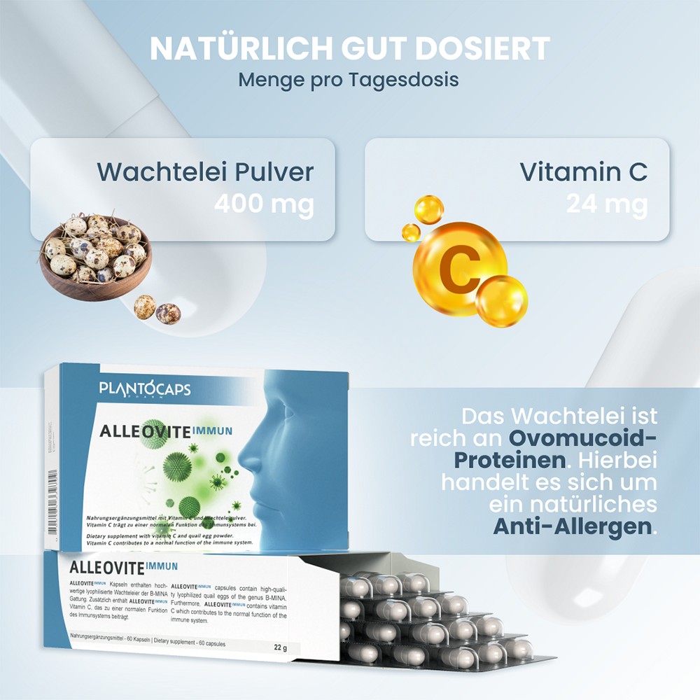 ALLEOVITE IMMUN Kapseln wurden nach aktuellen wissenschaftlichen Ergebnissen entwickelt und unter strengen Qualitätsrichtlinien hergestellt. Sie enthalten hochwertige lyophilisierte Wachteleier der B-MINA Gattung. Zusätzlich enthält ALLEOVITE IMMUN Vitamin C, das zu einer normalen Funktion des Immunsystems, sowie zum Schutz der Zellen vor oxidativem Stress beiträgt.ALLEOVITE IMMUN kann über einen längeren Zeitraum und vorallem regelmäßig eingenommen werden. Eine Packung enthält 60 Kapseln. Bei einer Tagesdosis von zwei Kapseln reicht eine Packung für einen Monat.
