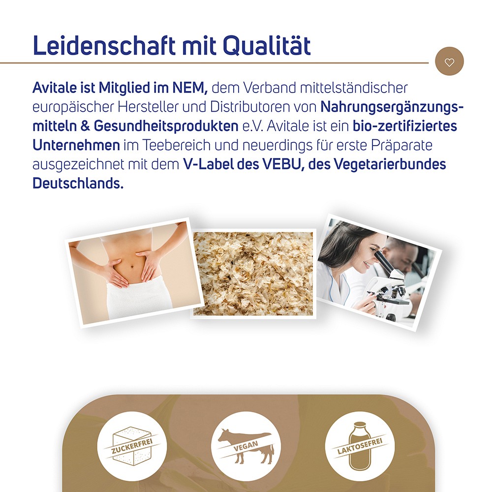 Produktsicherheit und Rohstoffqualität haben bei uns höchste Priorität. Regelmäßig stellen Experten durch aufwändige Untersuchungen sicher, dass das hervorragende Niveau unseres Sortiments konstant bleibt.Avitale Produkte – mehr Freude am Leben