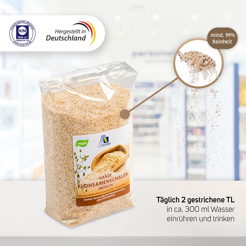 Reich an Ballaststoffen: 65g pro 100g FlohsamenschalenVerzehrempfehlung:
