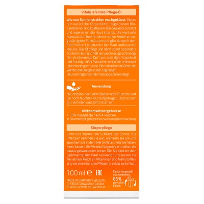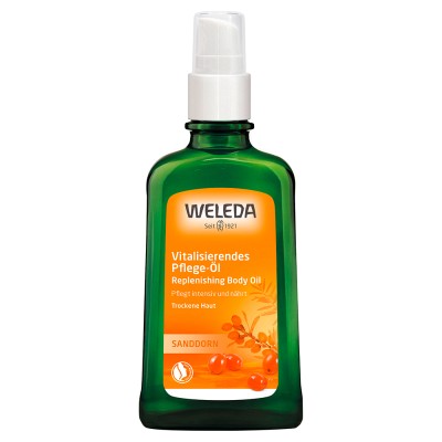 Das durch die enthaltenen Carotinoide rotgoldene Sanddornöl u.a. aus biologischem Anbau in der Toskana wird exklusiv für Weleda in einem besonders schonenden Verfahren gewonnen. Es ist reich an ungesättigten Fettsäuren und natürlichen Vitaminen, die zu den Vitalbausteinen der Zellen im menschlichen Organismus gehören und die wichtige Barrierefunktion der Haut unterstützen.
