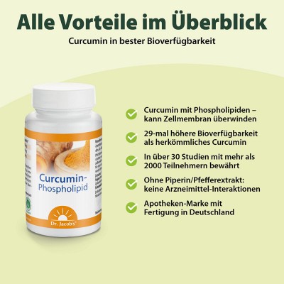 Die Kombination des Curcumin-Moleküls mit einem Phospholipid ahmt die natürliche Art der Resorption und Verstoffwechselung des fettlöslichen Curcumins nach. Die Bioverfügbarkeit ist hier 29-mal höher als bei herkömmlichem Curcumin. Die Zellmembranen können besser überwunden werden, was ein Vordringen in das Zellinnere ermöglicht.Das patentierte Curcumin-Phospholipid wurde in über 30 Studien mit mehr als 2000 Teilnehmern getestet.