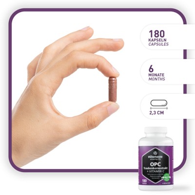 Antioxidans OPC Traubenkernextrakt und Vitamin C – eine ideale Kombination. Und das mit bester Bioverfügbarkeit und in gewohnter Qualität von Vitamaze.- 450 mg reines OPC pro Kapsel optimiert durch Vitamin C
