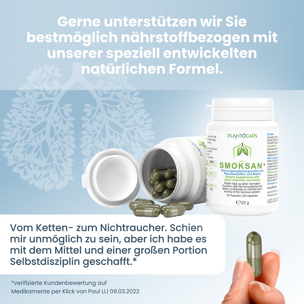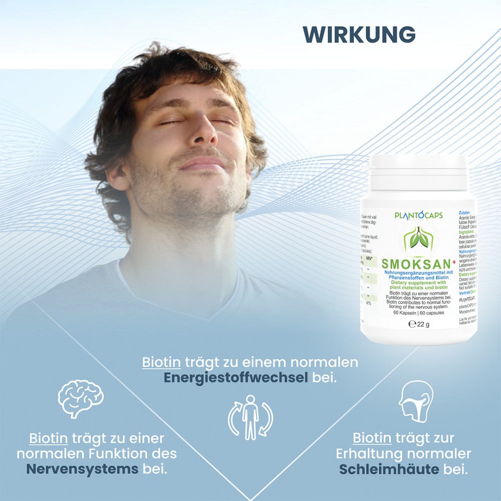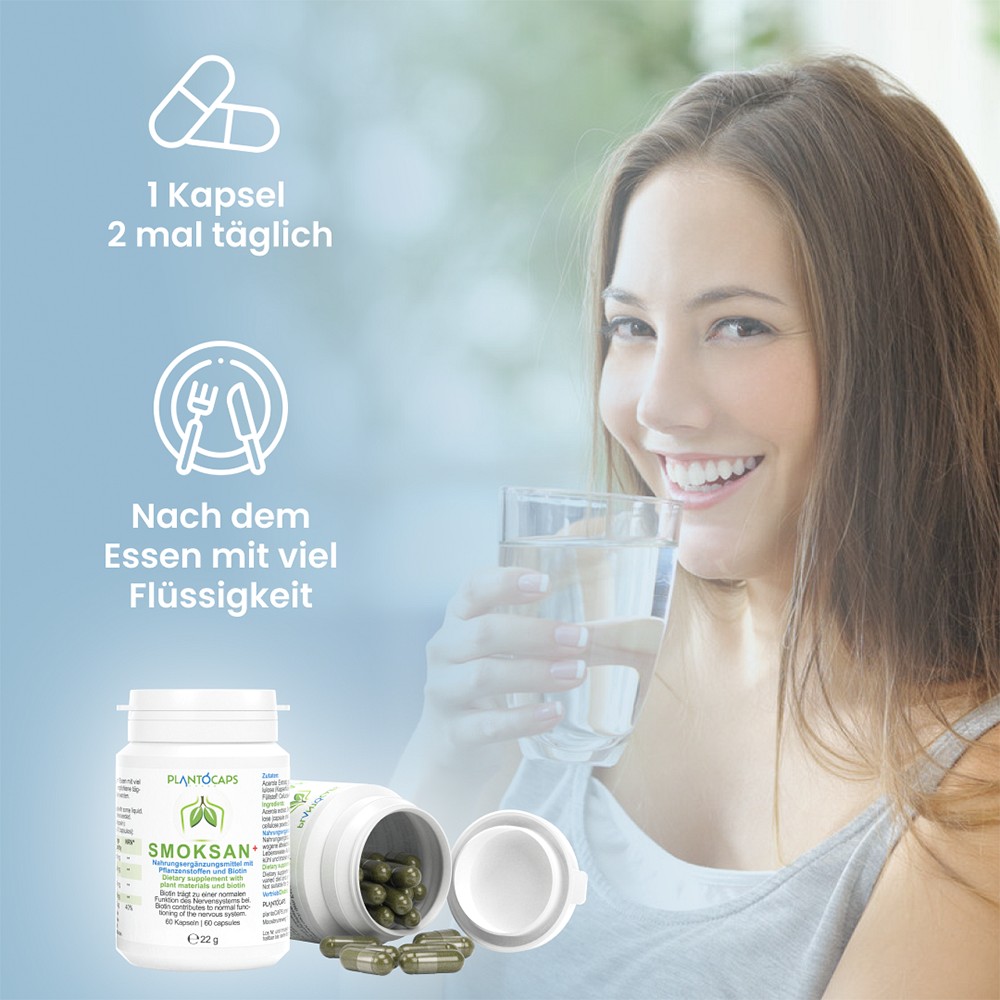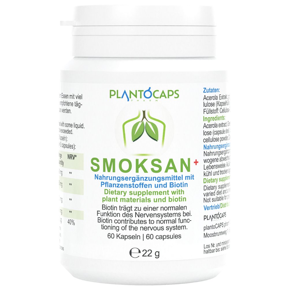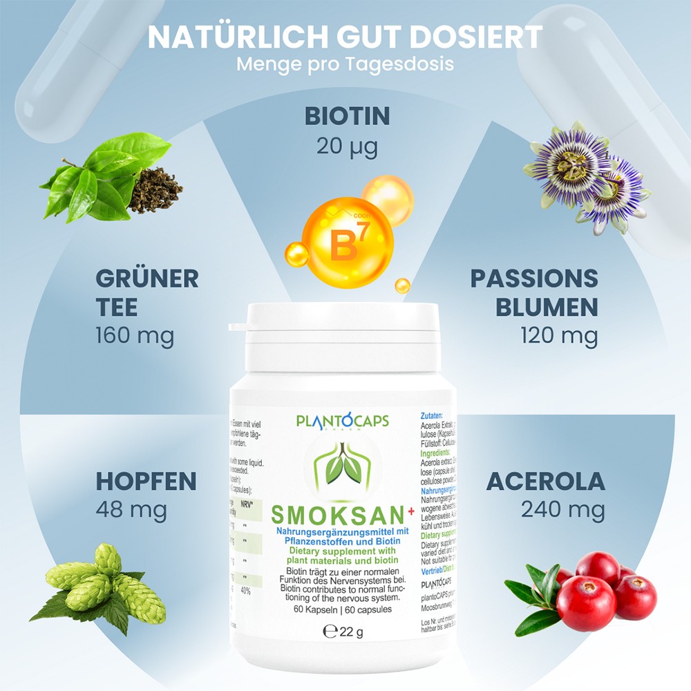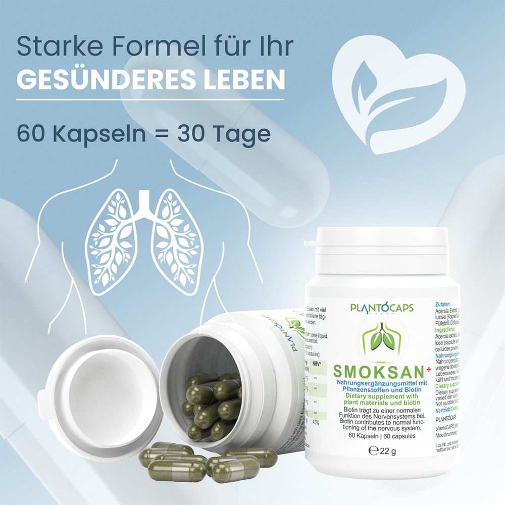 Die speziell entwickelten SMOKSAN+ Kapseln enthalten unter anderem Pflanzenstoff-Extrakte von Acerola, grünem Tee, Passionsblumen und Hopfen. Zusätzlich enthält SMOKSAN+ Biotin, das zur normalen Funktionsweise des Nervensystems beiträgt.Darüber hinaus trägt es zu einem normalen Energiestoffwechsel und zur Erhaltung normaler Schleimhäute (z.B. Lunge, Nase, Mund etc.) bei. SMOKSAN+ kann über einen längeren Zeitraum und vor allem regelmäßig eingenommen werden.