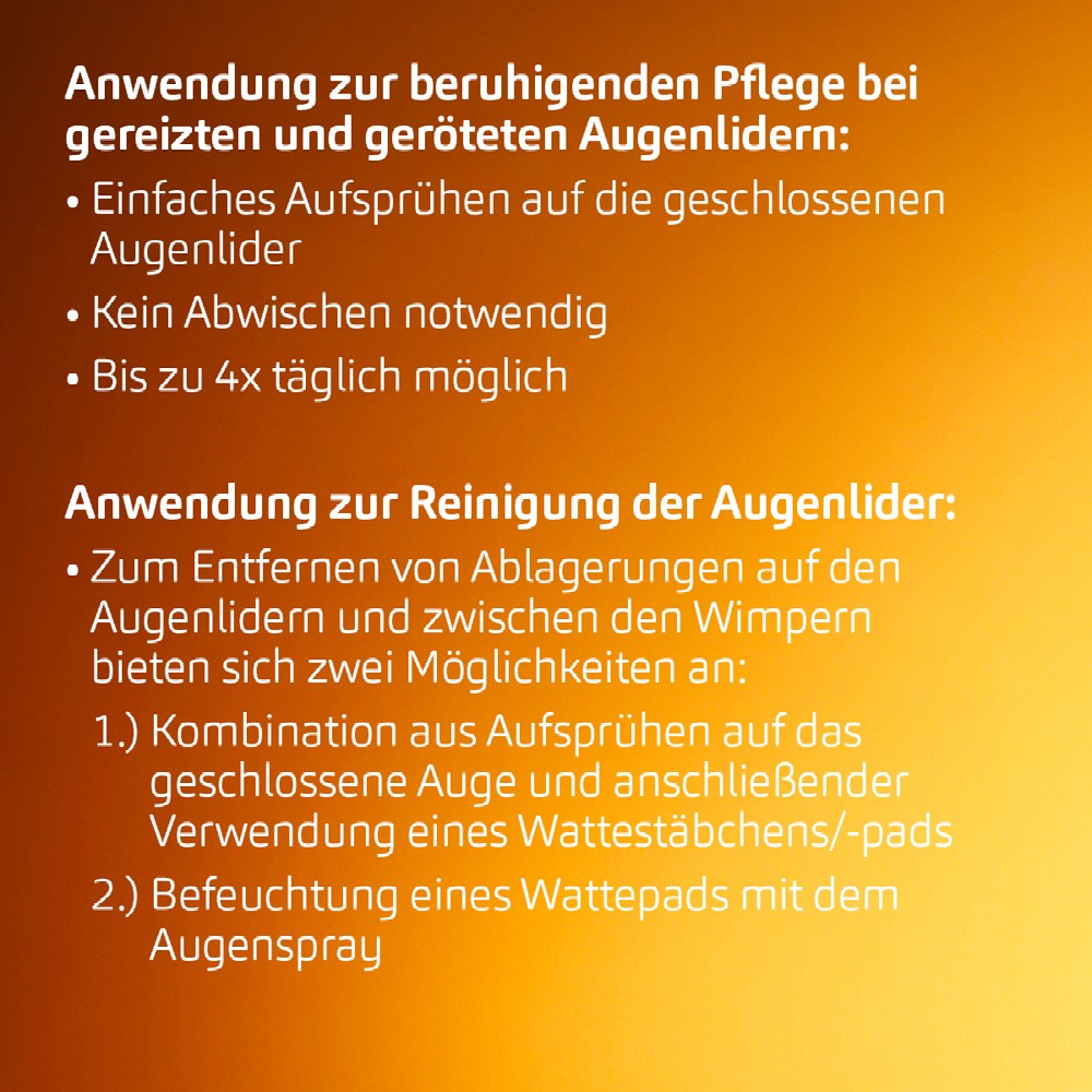 Neben der sorgfältigen Reinigung der Augenlider darf aber auch die Pflege nicht fehlen. Aufgrund ihrer Sensibilität ist die Lidhaut leicht reizbar und anfällig für Austrocknung. Kontinuierliche Augenlidpflege kann trockene Augenlider verhindern und vor Erkrankungen schützen. Insbesondere bei einer Lidrandentzündung ist sachgerechte Pflege sehr wichtig, um die Beschwerden zu lindern. Durch die in POSIFORLID® Augenspray enthaltende 3-fach Kombination wird die Lidhaut sanft gepflegt und beruhigt.