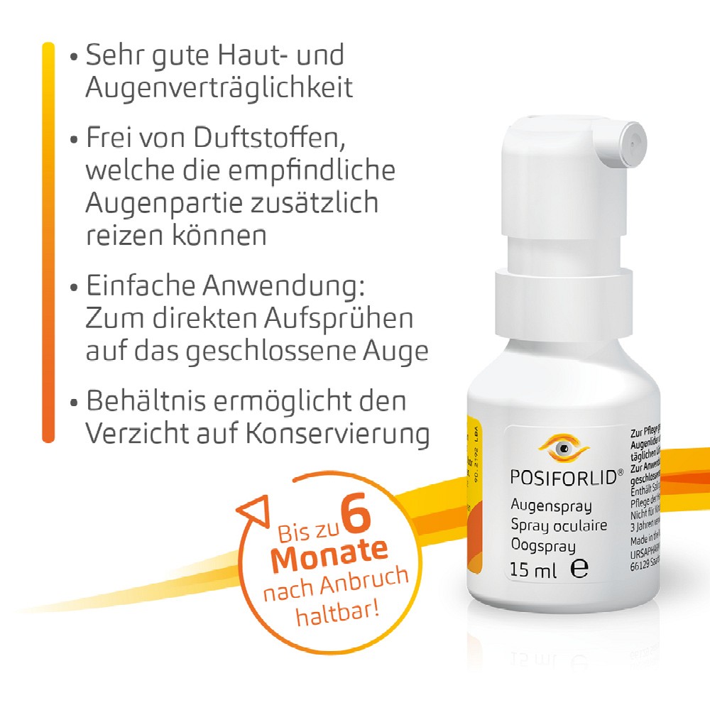 POSIFORLID® Augenspray ist frei von Konservierungsmitteln, Duftstoffen und Phosphaten. Es zeichnet sich durch eine sehr gute Haut- und Augenverträglichkeit* aus und ist zum direkten Aufsprühen auf das geschlossene Auge und zur dauerhaften Anwendung geeignet. Mithilfe eines Wattepads kann das Augenspray zur Reinigung der Augenlider angewendet werden.