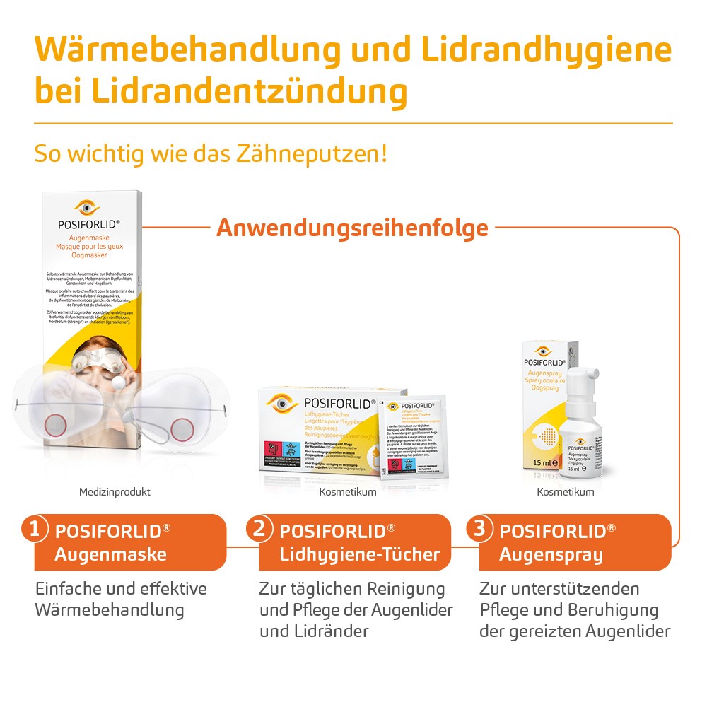 Bei einer chronischer Lidrandentzündung und Funktionsstörungen der Lidranddrüsen/ Meibomdrüsen-Dysfunktion ist die tägliche Lidrandhygiene ein wichtiger Bestandteil der Behandlung. Zur Entfernung von verkrusteten Ablagerungen an Augenlidern und Wimpern hat sich die Kombination aus Wärmebehandlung und sanfter Reinigung bewährt: Die Anwendung der selbsterwärmenden POSIFORLID® Augenmaske verflüssigt das Sekret der Lidranddrüsen und erweicht die Krusten am Lidrand, die sich bei der anschließenden Lidrandmassage mit POSIFORLID® Augenspray auf schonende Weise entfernen lassen.