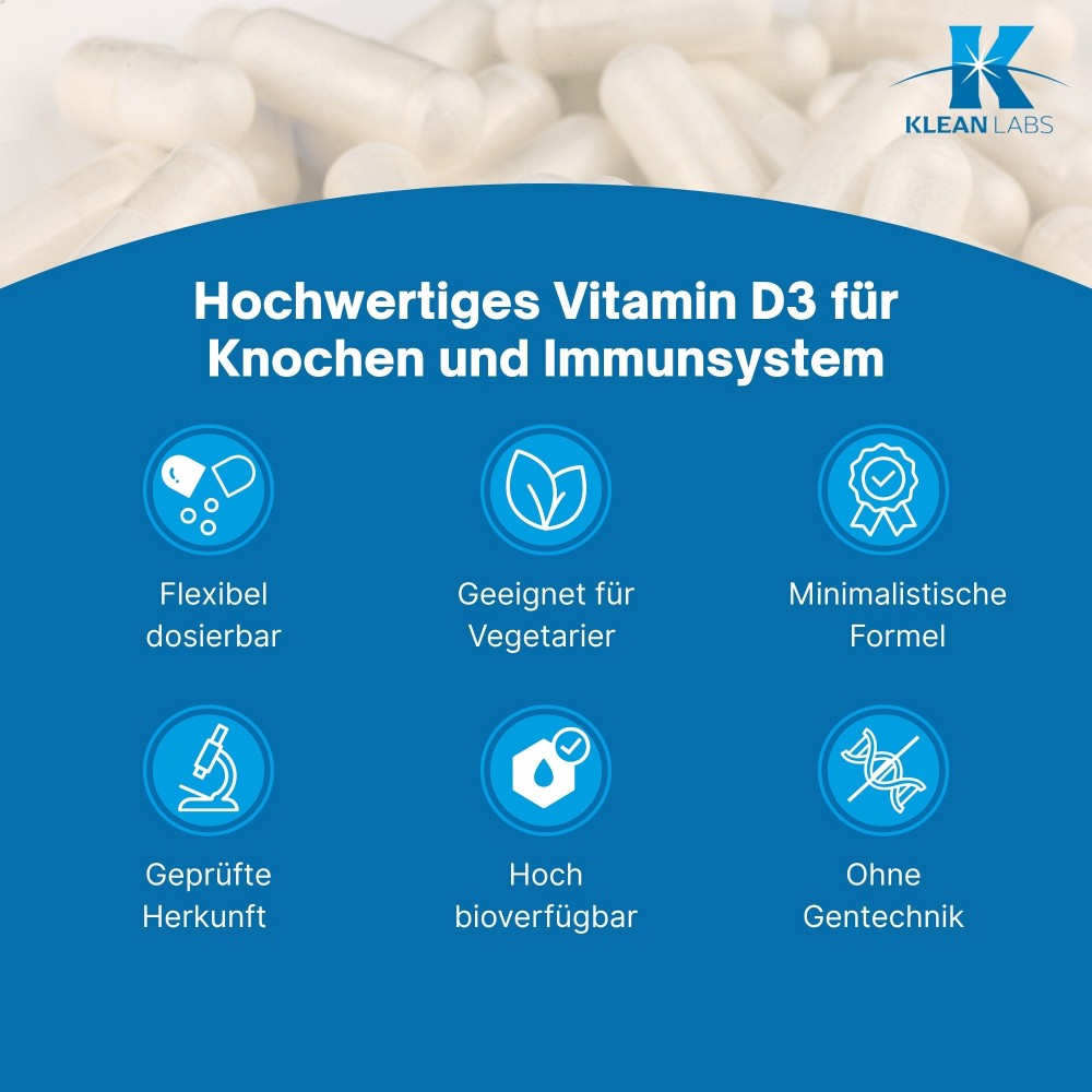 Vitamin D-3 1000 i.E. pro Tropfen von Klean Labs ist eine hochwertige, geschmacksneutrale und zuckerfreie D3-Lösung zur flexiblen Tagesversorgung. Jeder Tropfen liefert 1.000 Internationale Einheiten (25 µg) Vitamin D3 in MCT-Öl aus der Kokosnuss. Die ölbasierte Tropfenform ermöglicht eine einfache Einnahme und eine präzise, bedarfsgerechte Dosierung. Das Produkt ist vegetarisch, ohne Gentechnik und frei von künstlichen Zusatzstoffen.