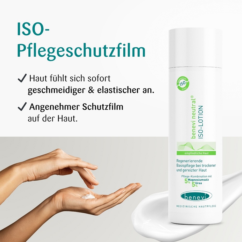 benevi neutral ISO-Lotion – Feuchtigkeitspflege bei trockener, schuppender Haut. Die benevi neutral ISO-Lotion ist eine dermatologisch getestete Körperpflege für trockene, juckende und schuppende Haut – auch bei altersbedingter Hauttrockenheit oder spannender Haut in der Schwangerschaft.