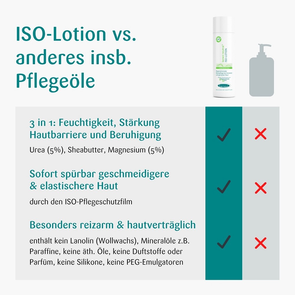 Die ISO-Lotion ist ideal für die tägliche Anwendung am gesamten Körper – etwa nach dem Duschen oder bei trockener Haut an Armen, Beinen, dem Rücken oder den Schienbeinen.