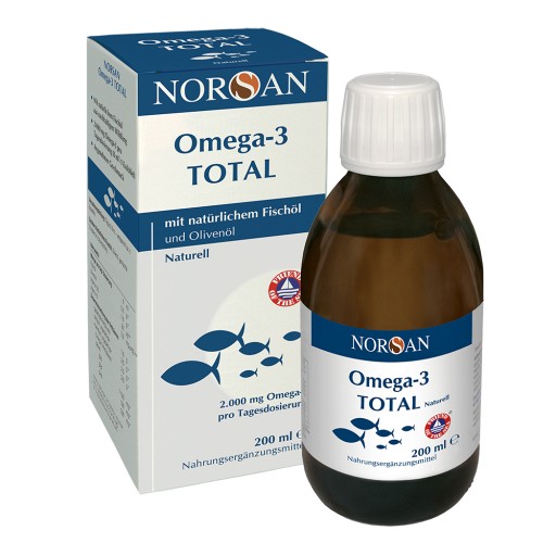 NORSAN Omega-3 Total enthält eine einzigartige Kombination von einem natürlichen, nicht-konzentrierten Fischöl aus Wild-fang sowie einem kaltgepressten Olivenöl. NORSAN Fischöl wird in Norwegen produziert. Die empfohlene Tagesdosis von 8 ml (1 Esslöffel) beinhaltet 5,3 Gramm Fischöl und 1,8 Gramm Olivenöl.