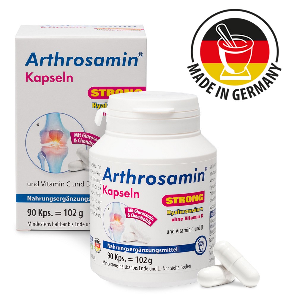 Arthrosamin<.sup>.®<./sup>. Gelenkkapseln mit hochdosierter und bewährter Wirkstoffkombination. Die gezielte Nahrung für Muskeln und Gelenke!Stark und hochwirksam mit Hyaluronsäure, aber ohne Vitamin K.<.br />.<.br />.⦁ Arthrosamin<.sup>.®<./sup>. Kapseln halten Sie in Bewegung!<.br />.⦁ Zum Erhalt normaler Knorpelbildung, sowie für Knochen und Muskeln<.br />.⦁ Hochdosiertes Glucosamin und Chondroitin ergänzt mit Hyaluronsäure und Vitaminen<.br />.⦁ Nur in der Apotheke - seit Jahren bewährt!<.br />.⦁ Hergestellt in Deutschland<.br />.<.br />.Arthrosamin<.sup>.®<./sup>. Gelenkkapseln sind seit vielen Jahren in Apotheken bewährt und halten ihren Innovationsstatus durch gezielte Produkterweiterungenfür die unterschiedlichen Bedürfnisse der Verbraucher. Die Wirkstoffkombination ist belegt durch aktuelle Forschungsergebnisseund verbessert nachweislich medizinisch relevante Faktoren. Die Rezeptur mit hochdosiertem Glucosamin und Chondroitin bewirkt gezielte Nahrung für Muskeln und Gelenke und erzielt, wissenschaftlich belegt, eine mit Schmerzmitteln vergleichbare Wirksamkeit in Bezug auf Schmerzverringerung bei Patienten mit Knie-Arthrose.<.br />.<.br />.<.br />.⦁ Glucosamin ist ein lebenswichtiger Baustein für Knorpel, Bänder, Sehnen und Knochen.<.br />.⦁ Chondroitin wird im Normalfall vom Körper selbst gebildet und sorgt dafür, dass in den <.br />. Knorpeln Flüssigkeit gebunden wird.<.br />.⦁ Vitamin C trägt zu einer normalen Kollagenbildung für eine normaleKnorpelbildung bei.<.br />.⦁ Vitamin D trägt zur normalen Muskelfunktion bei.
