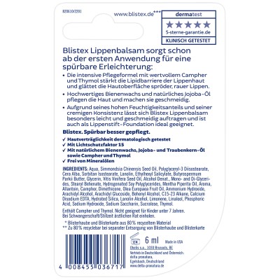 Aqua, Simmondsia Chinensis Seed Oil, Polyglyceryl-3 Diisostearate, Cera Alba, Sorbitan Isostearate, Lanolin, Ethylhexyl Salicylate, Butyrospermum Parkii Butter, Glycerin, Vitis Vinifera Seed Oil, Alcohol Denat., Mono- and Di-glycerides, Stearyl Behenate, Hydrogenated Soy Poly­glycerides, Mentha Piperita Oil, Aroma, Allantoin, Camphor, Dimethicone, Olea Europaea Fruit Oil, Ammonium Hydroxide, Arachidyl Alcohol, Arachidyl Glucoside, Behenyl Alcohol, C15-23 Alkane, Calcium Disodium EDTA, Hydrated Silica, Lanolin Alcohol, Limonene, Linalool, Phosphoric Acid, Sodium Hy­droxide, Sodium Saccharin, Sucralose, Thymol. Enthält Campher und Menthol.