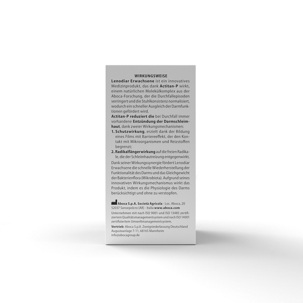 Lenodiar Erwachsene wirkt dank Actitan-P, einem pflanzlichen Molekülkomplex aus der Aboca-Forschung, der die Durchfallepisoden verringert und die Stuhlkonsistenz normalisiert, wodurch ein schneller Ausgleich der Darmfunktionen gefördert wird.Actitan-P wirkt der bei Durchfall vorhandenen Entzündung der Darmschleimhaut entgegen, dank zweier Wirkungsmechanismen: