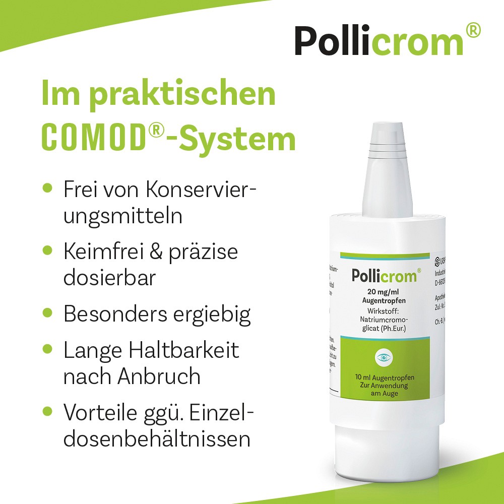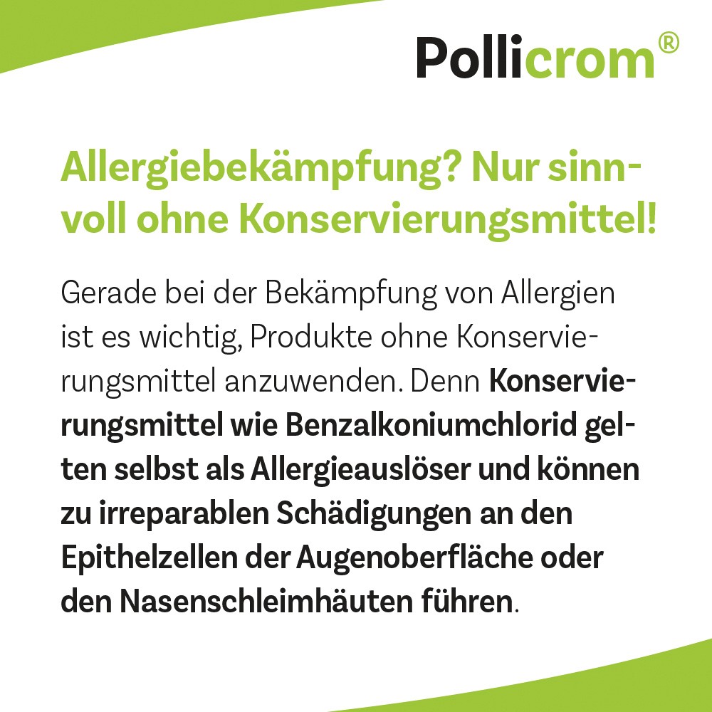 Viele Arzneimittel gegen allergische Symptome enthalten Konservierungsstoffe, um krankheitserregende Keime abzutöten. Konservierungsmittel wie z. B. Benzalkoniumchlorid gelten jedoch selbst als Allergieauslöser und können schwerwiegende und irreparable Schäden an Hornhaut und Schleimhäuten hervorrufen. Bei Pollicrom® Augentropfen wird bewusst auf den Einsatz von Konservierungsmitteln verzichtet.Dank des patentierten COMOD® Systems bleibt die Flüssigkeit steril und bis zu 12 Wochen nach Anbruch haltbar. Die innovative Ventiltechnik sorgt für eine exakte Dosierung und hohe Ergiebigkeit: Pro Pumpstoß wird nur 1 Tropfen freigegeben, die Flasche enthält mindestens 300 Tropfen.