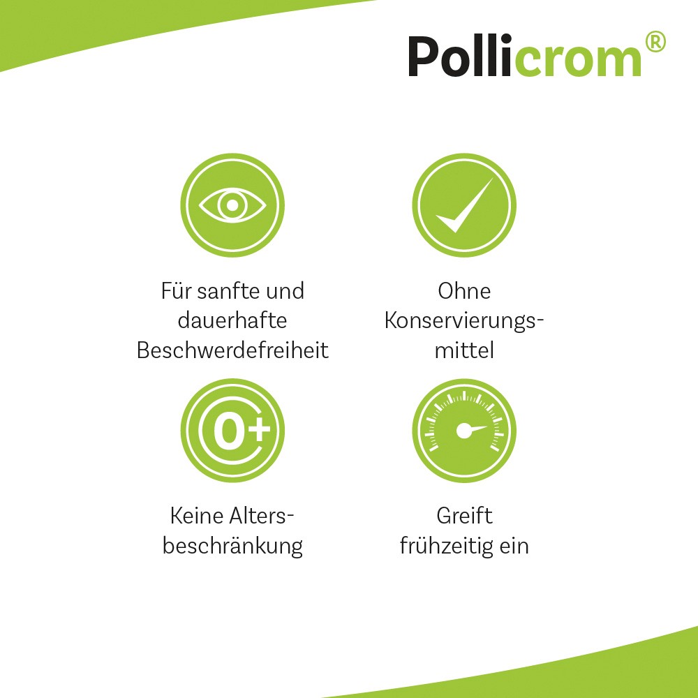 Pollicrom® Augentropfen mit dem Wirkstoff Cromoglicinsäure eignen sich als Basisschutz bei Allergie-Beschwerden am Auge. Soweit ärztlich nicht anders verordnet, wird 4-mal täglich 1 Tropfen in das Unterlid des erkrankten Auges getropft. Falls notwendig kann die Tagesdosis auf 6-mal täglich 1 Tropfen erhöht werden. Um die Entstehung starker Symptome zu verhindern, sollte das Medizinprodukt bereits einige Tage vor den ersten zu erwartenden Allergieerscheinungen angewendet werden.Bitte beachten Sie, dass mit einer Flasche Pollicrom® Augentropfen – wie auch bei alle anderen Augentropfen-Präparaten – stets nur dieselbe Person behandelt werden darf, um die Übertragung von krankheitserregenden Keimen zu vermeiden.