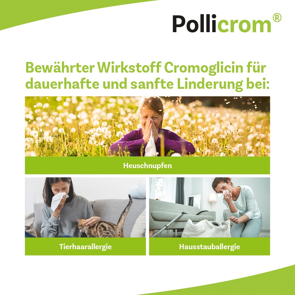 Allergische Beschwerden können sehr lästig sein und die Lebensqualität deutlich beeinträchtigen. Neben ständigem Niesen und Fließschnupfen leiden betroffene Personen bei Heuschnupfen, Hausstaub- oder Tierhaarallergie auch unter unangenehmen Symptomen an den Augen wie Brennen, Juckreiz, Rötungen und Schwellungen. Die frühzeitige sanfte Basisbehandlung mit Pollicrom® Augentropfen kann dafür sorgen, dass die leidigen Beschwerden dauerhaft in Griff zu bekommen sind.Der Inhaltsstoff Natriumcromoglicat hat sich zur sanften und dauerhaften Therapie von Allergiesymptomen vielfach bewährt. Er verhindert die Freisetzung von Histamin, also dem körpereigenen Stoff, der bei allergischen Reaktionen ausgeschüttet wird und die typischen Symptome auslöst. Ist das Histamin bereits freigesetzt, blockiert der gut verträgliche Arzneistoff den Nachschub aus den Mastzellen. Die Symptome einer allergisch bedingten Bindehautentzündung können somit dauerhaft gelindert werden.