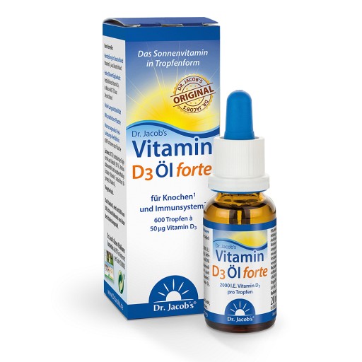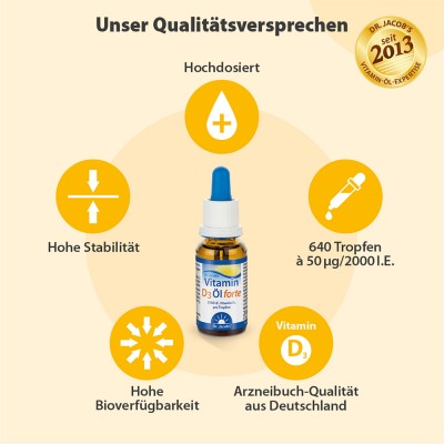 Bereits 2013 brachte Dr. Jacob’s als erster Hersteller ein Vitamin D3 Öl in deutsche Apotheken. Später folgte das höher dosierte Vitamin D3 Öl forte. Das verwendete Vitamin D3 entspricht Arzneibuchqualität und stammt aus Deutschland. Regelmäßige Analysen bestätigen die Langzeitstabilität des Vitamingehalts.Mit 640 Tropfen pro Flasche ist Dr. Jacob’s Vitamin D3 Öl forte sehr ergiebig. Ein Tropfen enthält 2000 I.E. (50 μg) Vitamin D3.