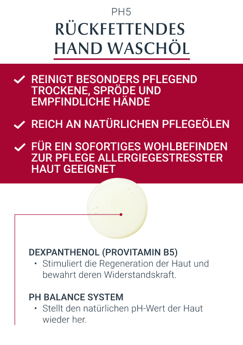 Das seifenfreie Reinigungsprodukt eignet sich ideal für die sanfte Reinigung von trockenen Händen. Dabei schützen der natürliche pH-Wert zusammen mit dem enthaltenen Dexpanthenol nachweisbar die natürliche Schutzfunktion sowie Widerstandskraft der Haut gegen äußere Einflüsse. Zusätzlich kann das Handwaschöl so einfach angewendet werden wie eine Seife, schäumt dabei mild und sorgt mit seinen seifenfreien Tensiden für eine sanfte Reinigung der Hände.