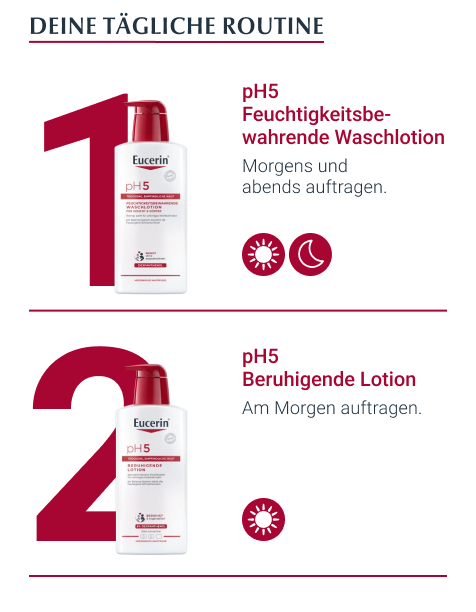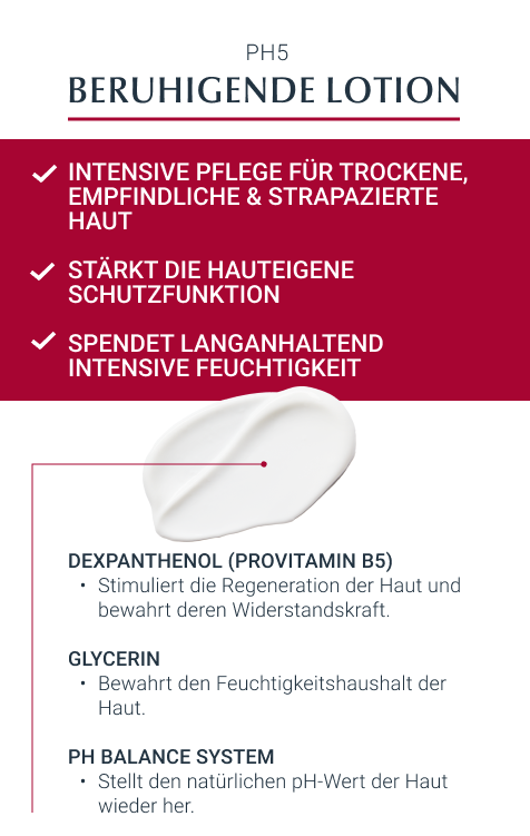 Mit der Hautpflege pH5 Lotion kann speziell strapazierte, empfindliche und trockene Haut gepflegt werden. Denn vor allem beanspruchte Haut reagiert leicht mit Spannungsgefühl, Hautirritationen und -rötungen auf Umweltreize und bedarf daher einer Hautpflege, welche die natürliche Schutzfunktion der Haut stärkt.Dank des Eucerin pH Balance Systems mit ph5 Citratpuffer wird der natürliche pH-Wert der Haut wiederhergestellt und gleichzeitig stimuliert der Inhaltsstoff 5% Dexpathenol die Regeneration der Haut und trägt dazu bei, ihre Widerstandskraft gegen äußere Einflüsse zu fördern. Somit unterstützt die Körperlotion die Wiederherstellung des physiologischen Gleichgewichts der Haut.