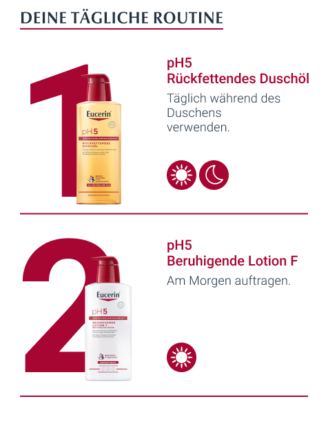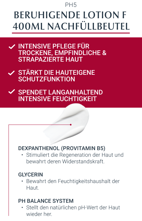 Die Eucerin pH5 Reichhaltige Lotion bietet eine spezielle Pflege bei empfindlicher, strapazierter und trockener Haut. Denn vor allem beanspruchte Haut reagiert leicht mit Spannungsgefühl, Hautirritationen und –rötungen auf Umweltreize und bedarf deshalb einer Hautpflege, die ihre natürliche Schutzfunktion verbessert. Die reichhaltige Lotion lässt sich dabei so einfach verwenden wie eine normale Bodylotion.Sanfte Körperpflege: Der natürliche pH-Wert der Haut wird durch das Eucerin pH Balance System mit ph5 Citratpuffer wiederhergestellt, während der Inhaltsstoff 3% Dexpanthenol die Regeneration der Haut unterstützt und ihre Widerstandskraft gegen äußere Einflüsse stärkt. Auf diese Weise wird das physiologische Gleichgewicht der Haut mit der Pflegecreme wiederhergestellt.