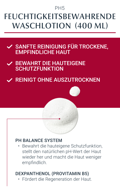 bietet empfindlicher und trockener Haut eine milde Reinigung & bewahrt die Schutzfunktion der HautDie Eucerin pH5 Waschlotion bewahrt den natürlichen pH-Wert und Dexpanthenol erhält nachweislich die natürliche Schutzfunktion und Widerstandskraft der Haut. Die Formel sorgt damit für eine sanfte Reinigung mit extra milden, seifenfreien Tensiden.
